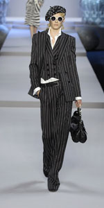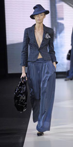 И все-таки человеком, который вывел женский брючный костюм из салонов на улицу, превратив его в повседневный casual, стал Джорджио Армани. Он создает брючные костюмы для мужчин и для женщин в элегантном стиле. Правда, под женским пиджаком не предполагается никакой одежды, кроме изящного белья. Кутюрье создает костюмы "для работающей, интеллигентной, внутренне зрелой женщины, которая придерживается строгого стиля, однако никогда не забывает, что она женщина".