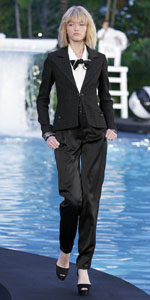 В 1966 году Ив Сен-Лоран впервые вывел на подиум манекенщиц в смокингах и брючных костюмах. Коллекция была моментально раскуплена, даже не смотря на то, что в брючных костюмах женщин не пускали в рестораны! Но богатые клиентки Сен-Лорана не желали сдаваться и при входе демонстративно снимали брюки, оставляя один жакет.