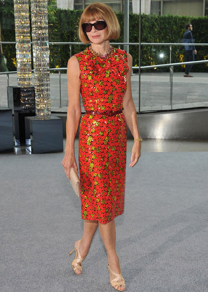 Анна Винтур – главный редактор Vogue в Америке и по совместительству женщина с безупречным чувством стиля – отдала предпочтение платью-футляру в мелкий цветочек красного и зеленого цвета, которое она дополнила тонким ремешком на талии и золотистым колье. К яркому платью Анна подобрала нейтральные босоножки телесного цвета и такой же клатч.