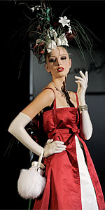 Кэти Прайс, любительница оригинальных нарядов, к своему черному вечернему платью выбрала необычный ридикюль в форме яйца, украшенный черными перьями.