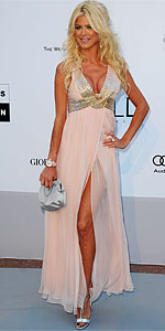 Шведская актриса и фотомодель Виктория Сильвстедт к своему нежно-розовому платью подобрала серебристый ридикюль в тон босоножкам.