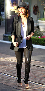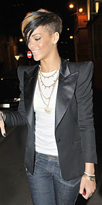 Хайден Панеттьери носит смокинг по-молодежному: с леггинсами, майкой и шляпой. Подобного плана комплект выбрала и Рианна, заменив леггинсы узкими джинсами.