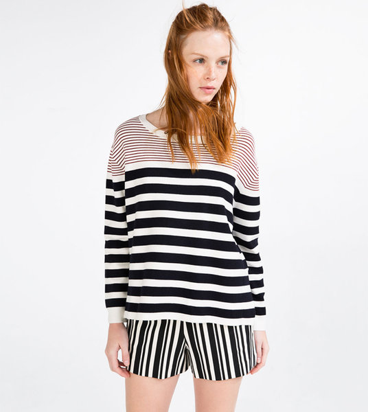 В случае прохладной погоды можно перейти на объемные свитеры в полоску грубой вязки. В компании с зауженными однотонными брюками или джинсами и мужскими ботинками свитер будет выглядеть вполне расслабленно и нескучно.