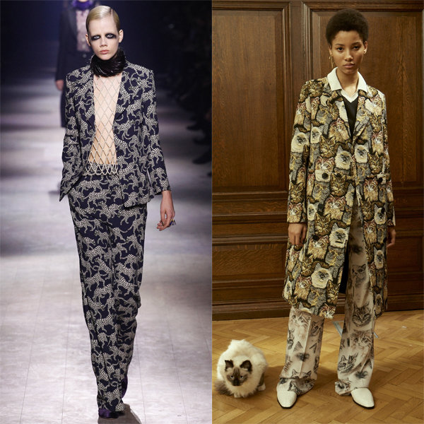 Игривый кошачий принт можно увидеть и на брючных костюмах. Причем для самых разных случаев. Строгий классический костюм Dries Van Noten украшают вполне милые тигры, а у Stella McCartney есть костюм в пижамном стиле с мимимишечными кошечками. Единственный минус: такой принт даже на деловой одежде неприемлем для офисного дресс-кода.