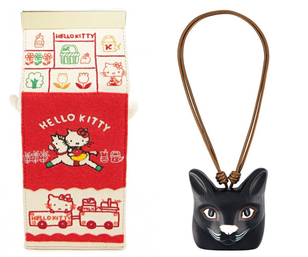 Еще одно любимое поле для фантазии дизайнеров — аксессуары, уж здесь можно отыграться на полную катушку! Очень женственно смотрятся котики в орнаменте шелковых платков. Любителям необычных решений стоит присмотреться к поясам с принтом или пряжкой, стилизованной под кошачьих. Особенно оригинально выглядит сумка в форме пакета молока с изображением Hello Kitty от Olympia Le-Tan. Более сдержанный аксессуар — украшение на шею от Loewe.