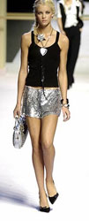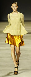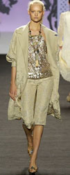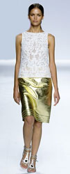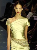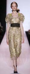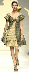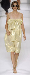 Но роскошь может быть и естественной. Таковые в этом сезоне укороченные платья от Burberry с завышенной талией, украшенной невинными бантиками. Гладкий тонкий шелк, имея какие-то вполне сдержанные цвета, все равно отливает золотом, и это смотрится очень мило. Из подобной же ткани выполнены и брючные комплекты от скандинавского дуэта Viktor & Rolf, в которых к легким широким брюкам прилагается длинная туника без рукавов. А британка Vivienne Westwood соединяет в своих воздушных объемных платьях тенденции Востока и Запада – античные драпировки и привезенные с Востока ткани (вроде тафты или парчи).