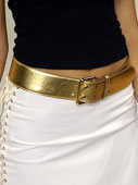 Поскольку нынешним летом нам предлагается всеми возможными способами подчеркивать собственную талию, то можно использовать ремни и пояса также из кожи с металлизированными напылением. Это могут быть довольно минималистские ремни из ровной кожи, привлекательные именно за счет золотого блеска разного оттенка, либо сложные конструкции, плетеные из золотых шнуров, цепей или толстой золоченой проволоки.