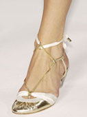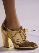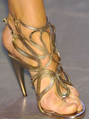 Ну, и вряд ли найдется много противников летних открытых босоножек из переплетения тонких кожаных ремешков золотистого или серебристого оттенка. Если у MacQueen это явная цитата из жизни древних богов с изысканным сложным переплетением ремешков необычной формы, то у Alberta Ferretti мы находим абсолютно современную практичную модель из тонкой золотистой кожи с открытыми мыском и пяткой, а также с золотистым шелковым шнуром, который несколько раз оборачивается вокруг щиколотки.