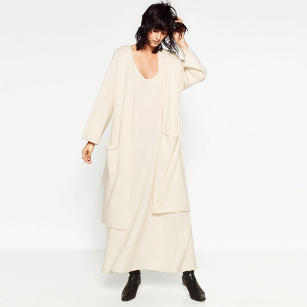 Специальную серию одежды, включающую кашемировые изделия, выпустила и любимая многими испанская марка Zara. Рекомендуем обратить внимание на белый свитер в актуальную в этом сезоне полоску, он будет навевать воспоминания о лете. Модный розовый свитер асимметричного кроя можно приобрести за 12 599 рублей, в эту же цену — длинное платье из кашемира цвета небеленого полотна. Есть в специальной серии и кашемировые аксессуары — шарфы и шапка.