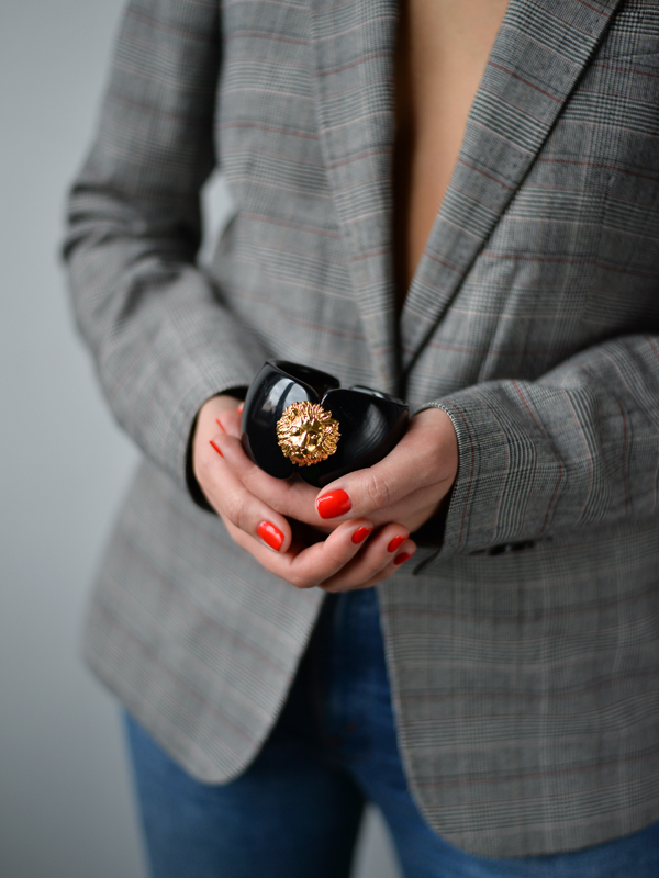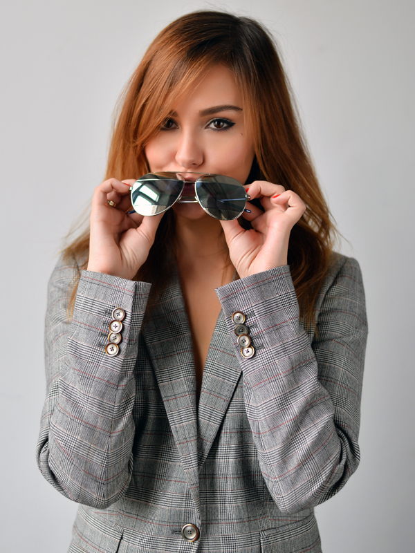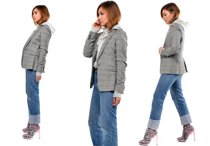 В основе этого образа — моя самая любимая вещь в гардеробе: винтажные джинсы Levi's. Им уже очень много лет, но я готова носить их хоть каждый день. Они отлично смотрятся в компании с жакетом в клетку Massino Dutti, обычным серым худи (нашла его в Zara) и ботильонами из последней коллаборации H&M с Kenzo.