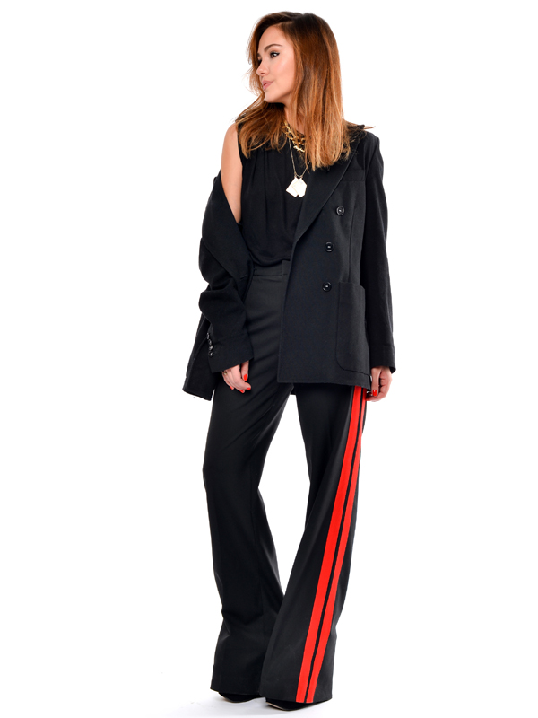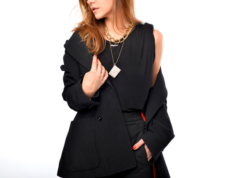 Люблю брать напрокат что-нибудь из гардероба мужа. Например, в основе этого образа — простая черная футболка из H&M и колье с подвесками в виде марок, позаимствованные из его гардероба. Мне нравится надевать их с актуальными в этом сезоне штанами с лампасами Zara и шерстяным жакетом Isabel Marant Étoile. Кстати, второе колье в этом образе — еще одно мое ценное приобретение: нашла его на блошином рынке в Риме. В таком виде я могу появиться абсолютно в любом месте, например, забрать сына из садика или отправиться на деловую встречу.