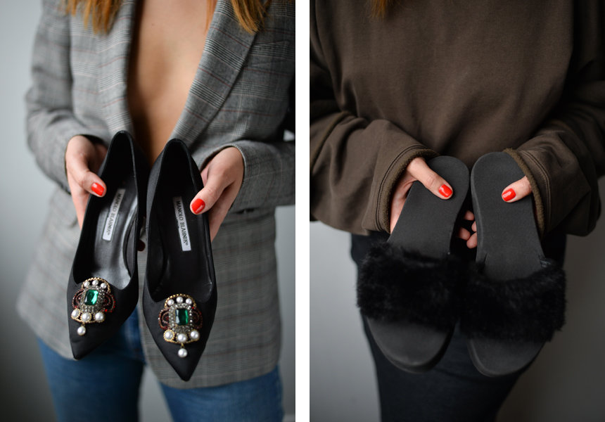 Обувь люблю совершенно разную. В моем гардеробе нет ни одних классических лодочек бежевого или черного цвета. Даже если это какая-то элегантная обувь, то обязательно будет интересный элемент, например, пряжка, похожая на ювелирную брошь, либо акцент будет сделан на фактуре — необычная кожа, ткань. Люблю остромодную обувь, которая обращает на себя внимание. Даже если она будет черной, то модель будет с какой-нибудь «изюминкой». На каждый день часто выбираю обувь в мужском стиле (ее я также обожаю!), реже — кроссовки. Последняя моя любовь — лаковые черные ботильоны Ekonika. Они у меня недавно, но я уже придумала с ними столько классных образов, дело за малым — воплотить!