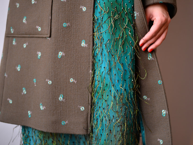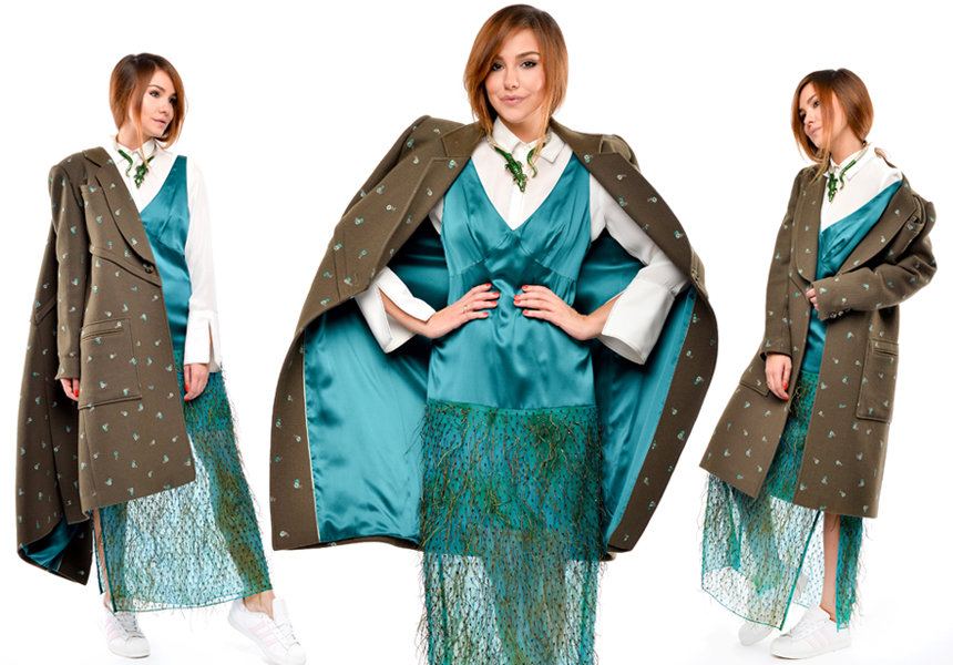 Мне очень нравится, что делает Ксения Авакян. Я обожаю ее пальто, брючные костюмы, платья — в них продумана каждая деталь, они сшиты идеально. В основе этого образа — пальто и платье-комбинация с перьями как раз из ее коллекции. Платье вечернее, оно отлично смотрелось бы на загорелой коже и в компании бежевых лодочек, но я люблю поиграть с подачей. Микс неожиданных вещей — это мое, хотя мне и нравятся элегантные вещи. В данном случае белые кроссовки поддерживают белую рубашку.