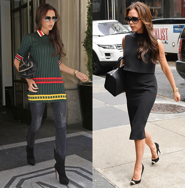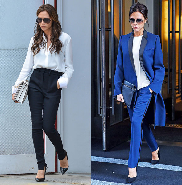Лаконичные наряды без декоративных элементов — ее фирменный стиль. Куда важнее для нее цвет и фактура наряда. Как можно заметить, Виктория придерживается темной цветовой гаммы и избегает сочетания нескольких сложных фактур в одном образе. Однако миссис Бекхэм можно увидеть и в платьях сочных летних цветов, и в ярких костюмах, выполненных в светлой цветовой гамме.