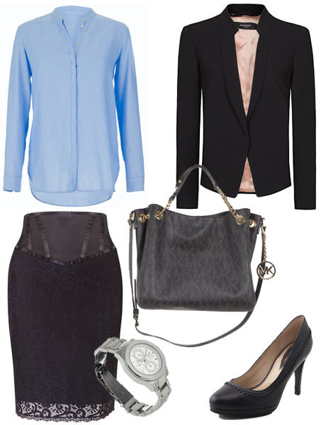 Юбка Love Republic, рубашка Zara, пиджак Mango, туфли Thomas Munz, сумка Michael Michael Kors, часы Karl Lagerfeld