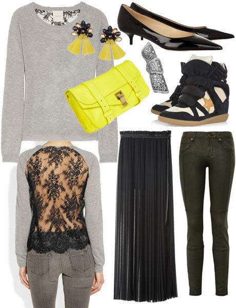 Свитер Mason By Michelle Mason, юбка Diesel, брюки Burberry Brit, туфли Jimmy Choo, кеды Isabel Marant, сумка Proenza Schouler, серьги Marni, кольцо Loree Rodkin
