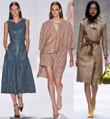 Модный тренд весны-лета 2013 — перфорация на коже с помощью лазерной резки, что визуально напоминает искусное кружево. Роскошные кружевные куртки, сумки и платья из кожи можно встретить в коллекциях Giles, Proenza Schouler, Sportmax, Ralph Lauren, Versace, Calvin Klein, Jason Wu, Jitrois, Carven.