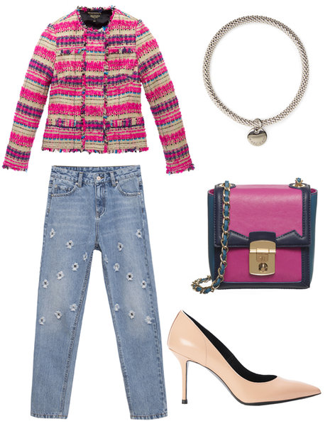 Актуальные в этом сезоне рваные джинсы-бойфренды отлично будут смотреться в компании с нарядной блузкой или ярким твидовым жакетом, а цветные лодочки и сумка помогут расставить праздничные акценты. Такой модный образ будет особенно актуален для поклонниц повседневного стиля, не готовых отступать от него даже в свой день рождения.
