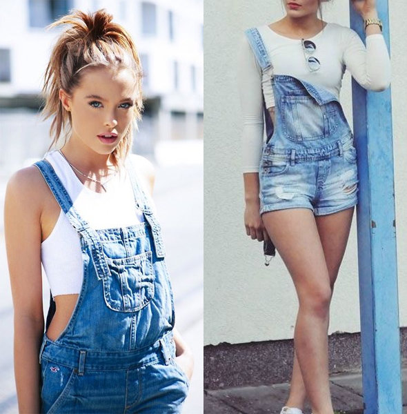 Тем, кто держит руку на пульсе моды, стоит отдать предпочтение ультрамодному сочетанию комбинезона с укороченным топом. В этом случае топ может быть как облегающим, так и в виде укороченной майки или футболки. Такой вариант отлично сочетается с обувью на плоской подошве — сандалиями, кедами, босоножками.