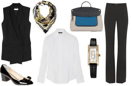 В образе использованы: жилет Michael by Michael Kors, блузка Zara, брюки Max&Co, шейный платок River Island, часы Ника, сумка Furla, туфли Riarosa