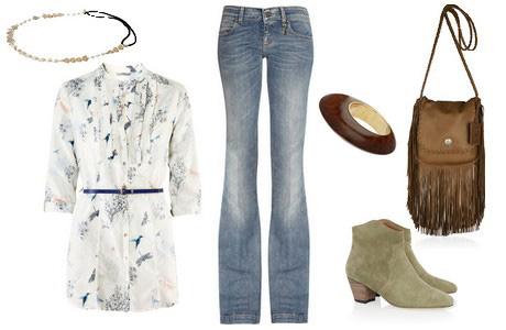 Стильный выбор - джинсы-клеш. С ними вы легко можете поиграть с образами. Надев широкую тунику, вы превратитесь в девушку-хиппи. Впрочем, бесформенную тунику можно заменить на блузку с крупным цветочным принтом или с принтом в виде животных, птиц.