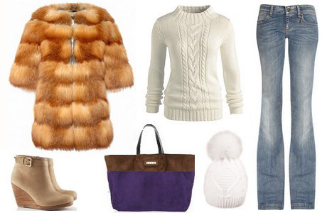 Не стоит бояться модных экспериментов, даже если на улице зима. Шуба из рыжей лисы - вещь не только красивая и теплая, но и отлично сочетающаяся с джинсами-клеш. Подбираем вязаный косами свитер и в пару к нему вязаную по голове шапочку с крупным помпоном.